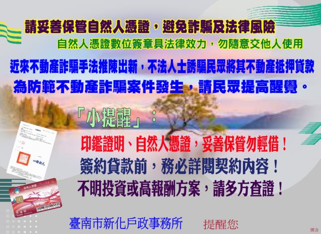 近來不動產詐騙手法推陳出新,不法人士誘騙民眾將其不動產抵押貸款,為防範不動產詐騙案件發生,請民眾提高醒覺。💡 「小提醒」:✅ 印鑑證明、自然人憑證,妥善保管勿輕借!✅ 簽約貸款前,務必詳閱契約內容!✅ 不明投資或高報酬方案,請多方查證!📞 「如有疑慮,請向戶政事務所或地政機關諮詢。」